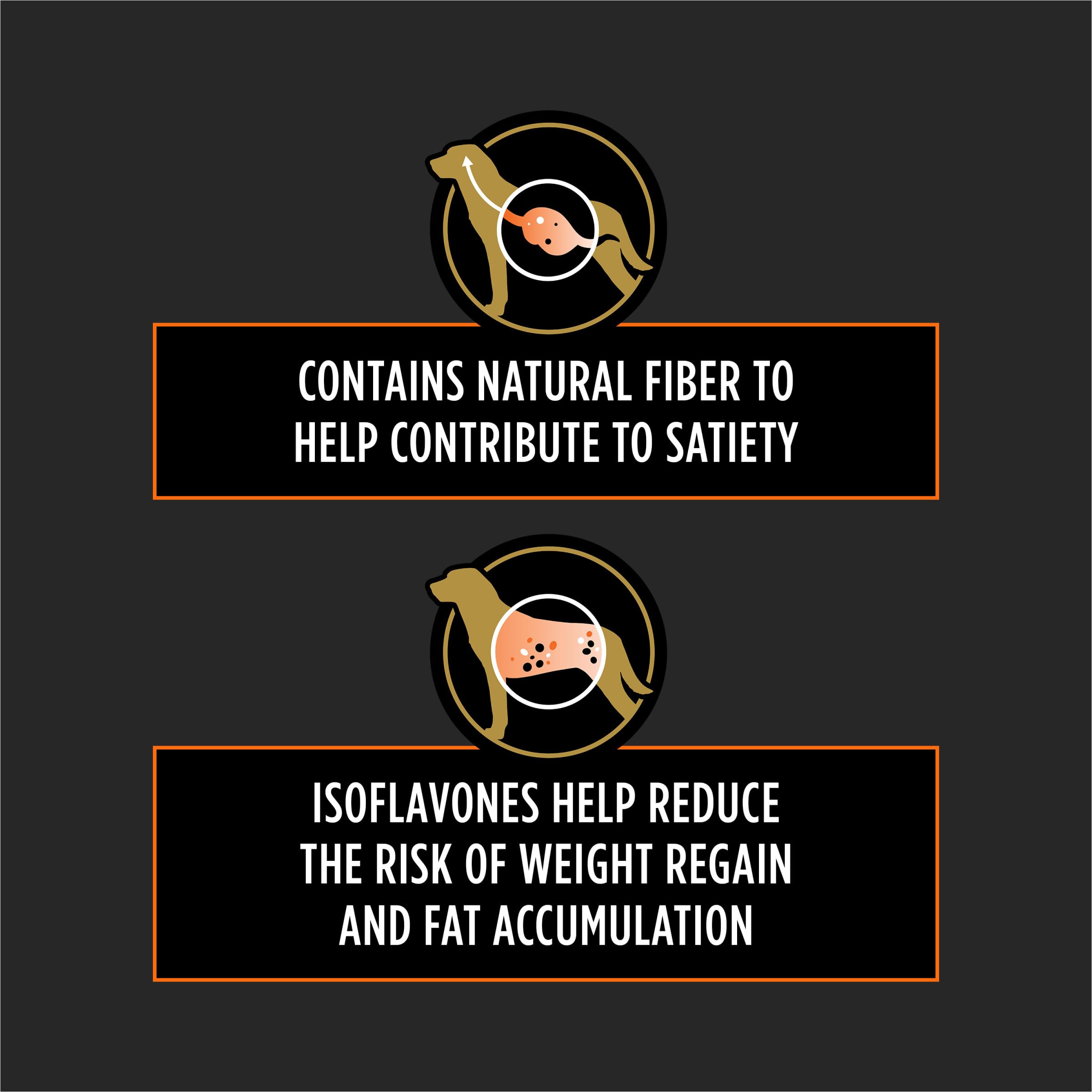 - Purina Pro Plan weight management dog food containing natural fiber to help contribute to satiety